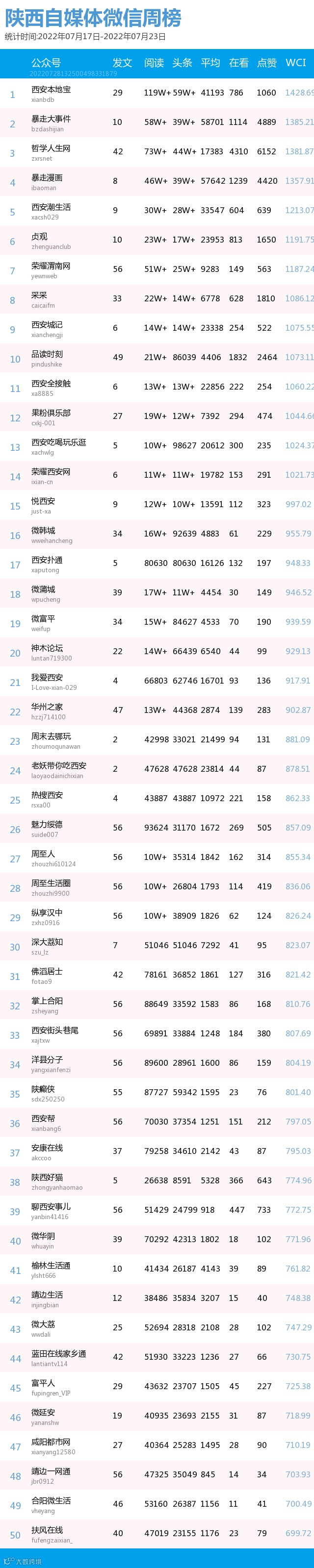 最新陕西自媒体微信公众号50强重磅出炉!TOP50上周共计发文1493篇,贡献阅读总量786万+,在看总量1万+,阅读总量较上周有所上升,希望下期各大平台加油哟~(查看榜单可直接下滑)