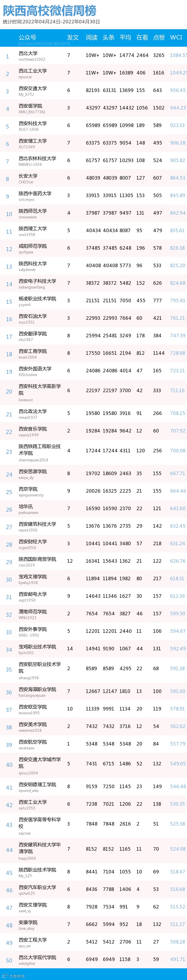 最新陕西高校微信公众号50强重磅出炉!TOP50上周共计发293篇,贡献阅读总量128+,在看总量7941,阅读数据较上周有所下降,希望各大平台下期继续加油哦~(查看榜单可直接下滑)