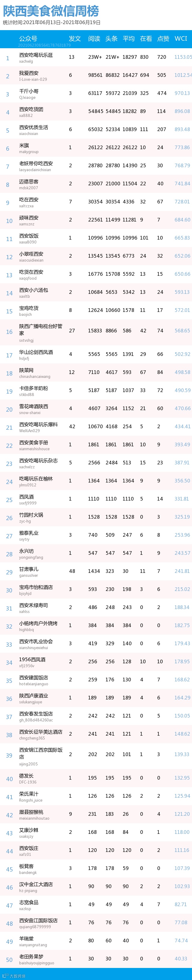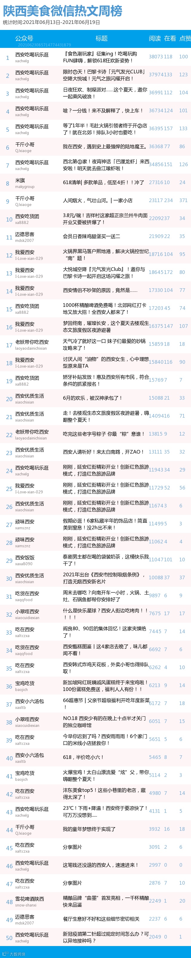 最新陕西美食类微信公众号50强重磅出炉!TOP50上周共计发文259篇,阅读总量达到77万+,在看总量达到2594。阅读总量较上周有所上升,希望下期各大平台再接再厉!(查看榜单可直接下滑)