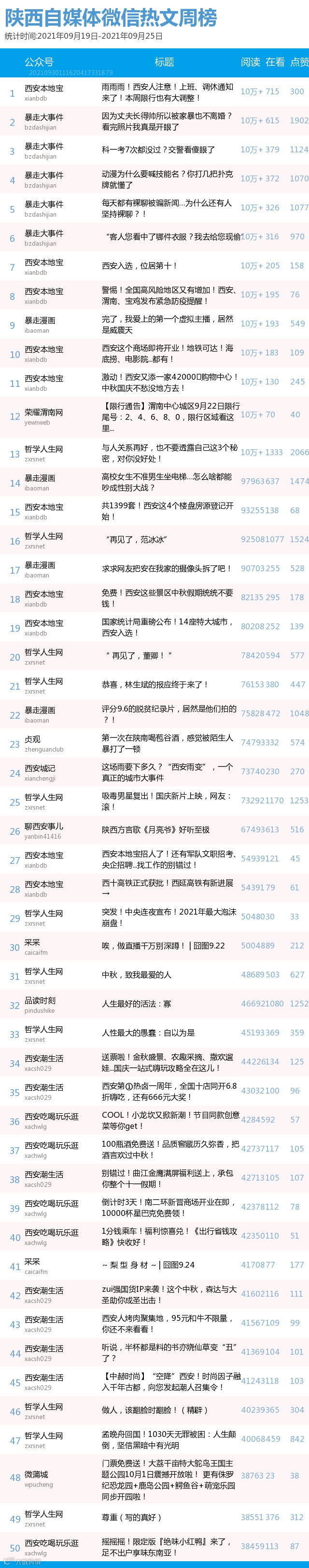 最新陕西自媒体微信公众号50强重磅出炉!TOP50上周共计发文1439篇,贡献阅读总量860万+,在看总量3万+,阅读总量较上周有所下降 ,希望下期各大平台加油哟~(查看榜单可直接下滑)