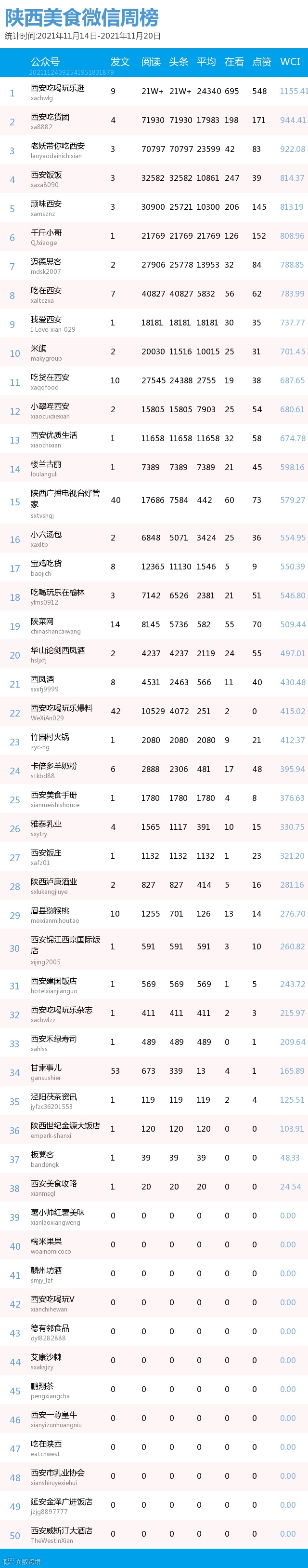 最新陕西美食类微信公众号50强重磅出炉!TOP50上周共计发文254篇,阅读总量达到69万+,在看总量达到2028。阅读总量较上周有所上升,希望下期各大平台再接再厉!(查看榜单可直接下滑)