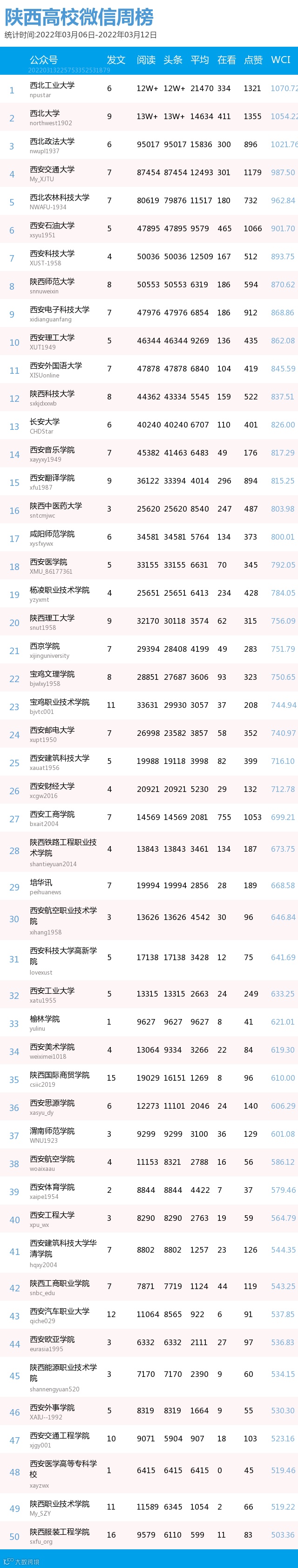 最新陕西高校微信公众号50强重磅出炉!TOP50上周共计发314篇,贡献阅读总量155+,在看总量5751,阅读数据较上周有所上升,希望各大平台下期继续加油哦~(查看榜单可直接下滑)