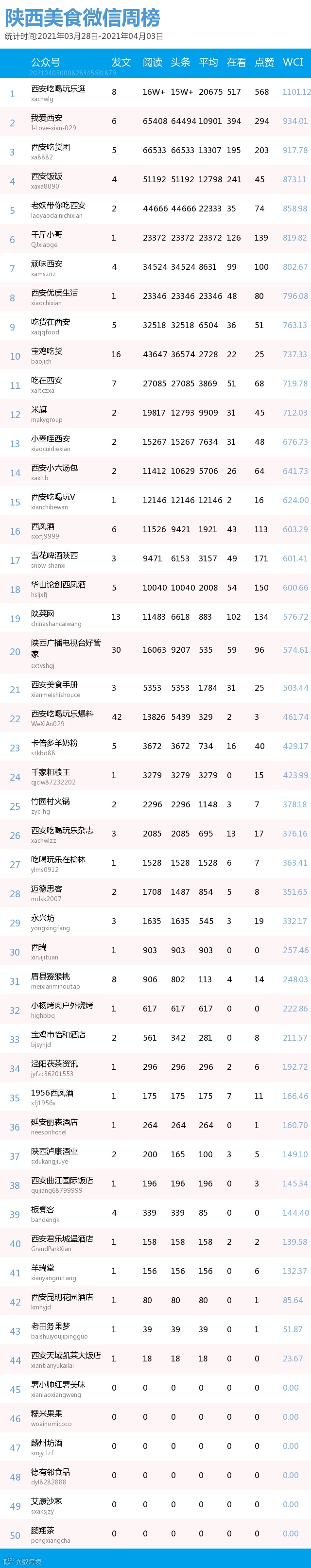 最新陕西美食类微信公众号50强重磅出炉!TOP50上周共计发文212篇,阅读总量达到72万+,在看总量达到2258。阅读总量较上周有所下降,希望下期各大平台再接再厉!(查看榜单可直接下滑)