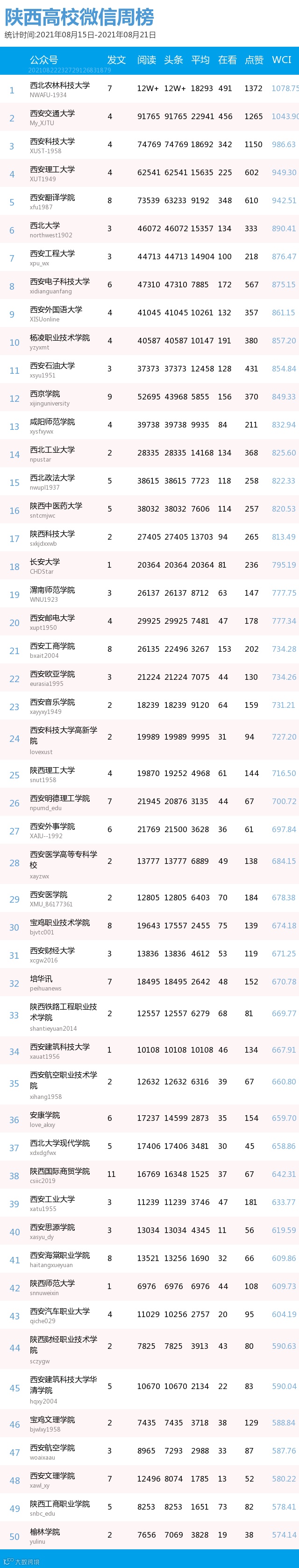 最新陕西高校微信公众号50强重磅出炉!TOP50上周共计发211篇,贡献阅读总量141万+,在看总量4988,阅读数据较上周有所上升,希望各大平台下期继续加油哦~(查看榜单可直接下滑)