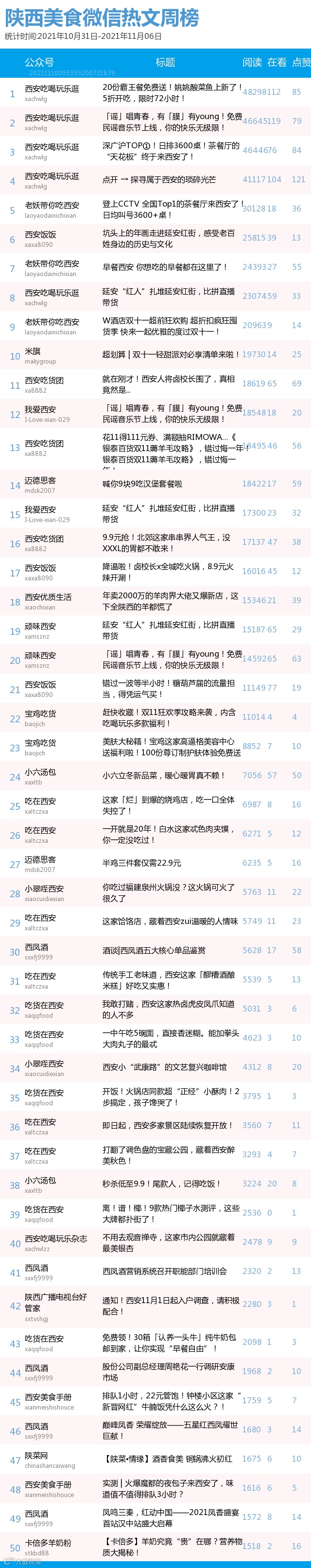 最新陕西美食类微信公众号50强重磅出炉!TOP50上周共计发文257篇,阅读总量达到60万+,在看总量达到1433。阅读总量较上周有所上升,希望下期各大平台再接再厉!(查看榜单可直接下滑)