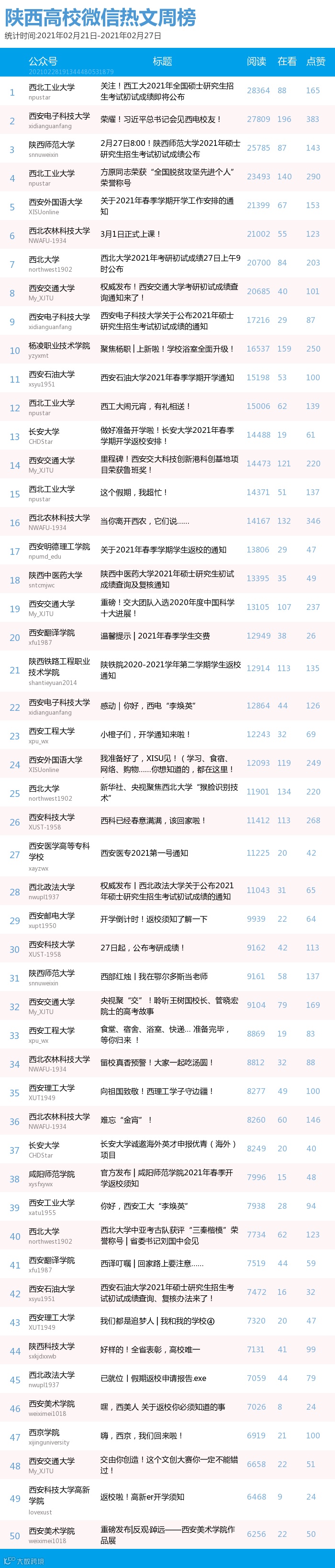 最新陕西高校微信公众号50强重磅出炉!TOP50上周共计发243篇,贡献阅读总量103万+,在看总量5084,阅读数据较上周有所上升,希望各大平台下期继续加油哦~(查看榜单可直接下滑)