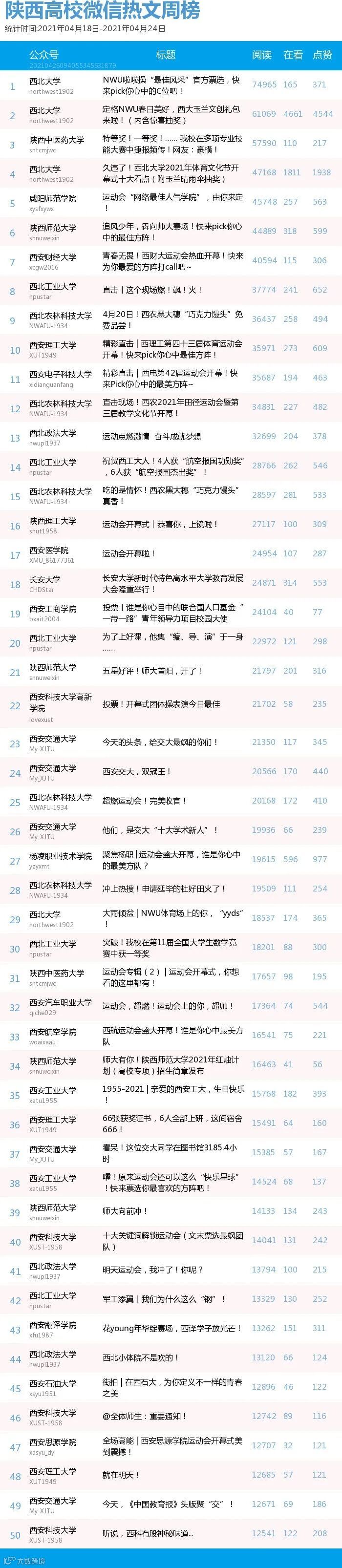 最新陕西高校微信公众号50强重磅出炉!TOP50上周共计发328篇,贡献阅读总量205万+,在看总量2万+,阅读数据较上周有所上升,希望各大平台下期继续加油哦~(查看榜单可直接下滑)