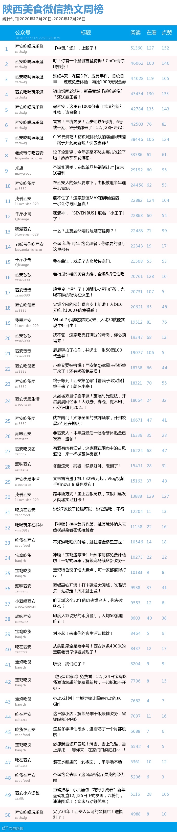 最新陕西美食类微信公众号50强重磅出炉!TOP50上周共计发文315篇,阅读总量达到107万+,在看总量达到3086。阅读总量较上周有所上升,希望下期各大平台再接再厉!(查看榜单可直接下滑)