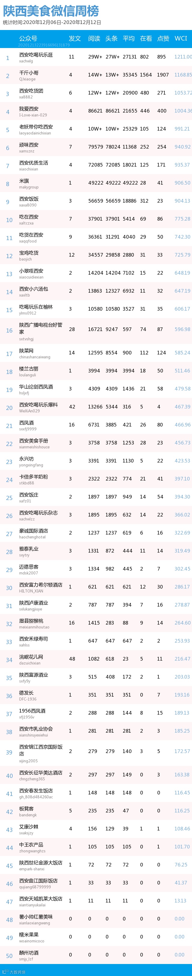 最新陕西美食类微信公众号50强重磅出炉!TOP50上周共计发文298篇,阅读总量达到122万+,在看总量达到4708。阅读总量较上周有所上升,希望下期各大平台再接再厉!(查看榜单可直接下滑)