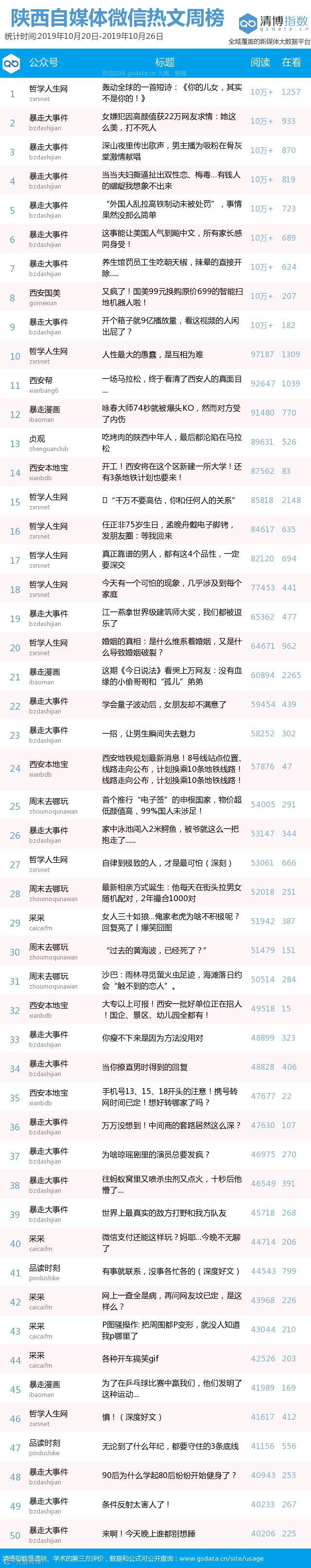 最新陕西自媒体微信公众号50强重磅出炉!TOP50上周共计发文1383篇,贡献阅读总量1009万+,在看总量5万+,阅读总量较上周有所上升,在看人数与上周持平,希望下期各大平台加油哟~(查看榜单可直接下滑)