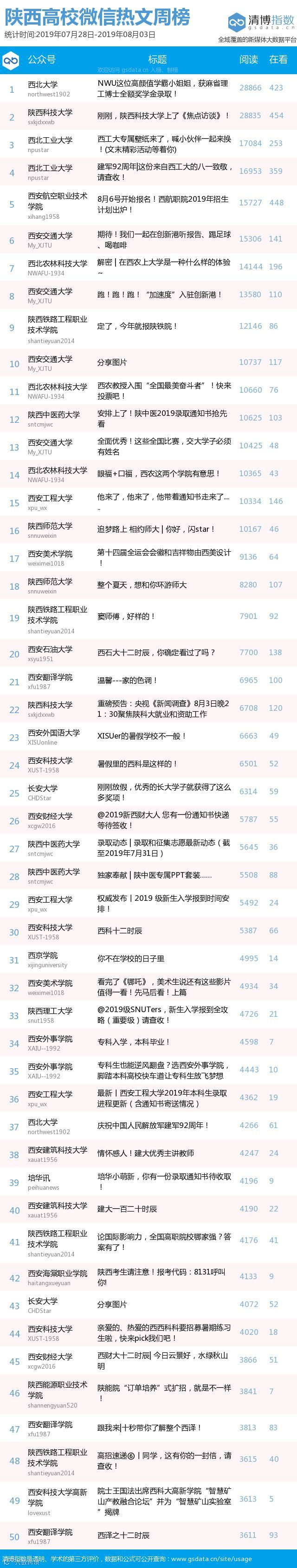 “西北工业大学”本周共发布2篇文章,阅读量达到了3万+,在看总量为761.77。“西安交通大学”共发布4篇文章,阅读总量为4万+,在看总量为761.18。“西北大学”共发布2篇文章,阅读总量为3万+,在看总量为760.19。
