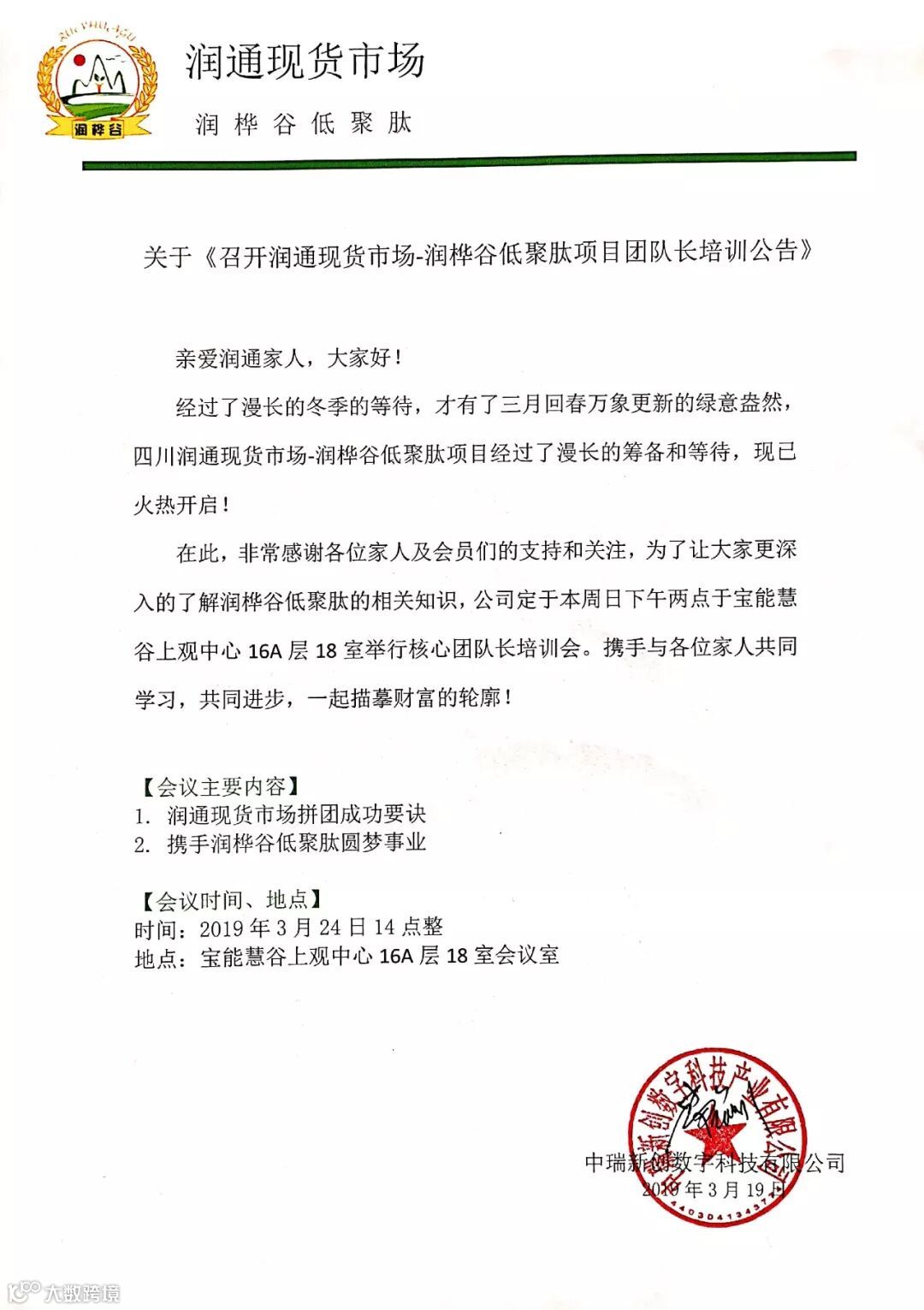 关于《召开润通现货市场-润桦谷低聚肽项目团队长培训公告》