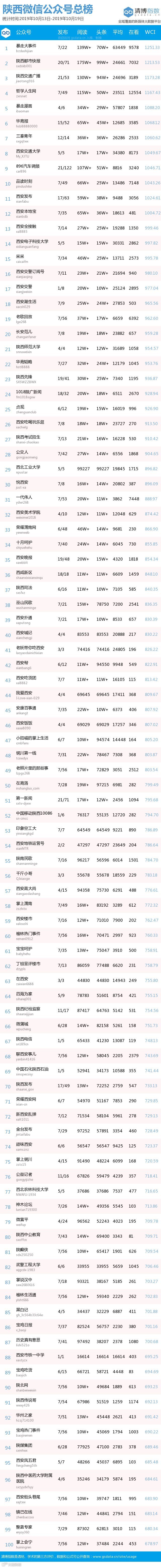 最新陕西微信公众号总榜周榜100强重磅出炉!TOP100上周共计发文2668篇,阅读总量达2189万+,在看总量13万+。各项数据相比上期均有大幅增长,希望下期各大平台再接再厉!(查看榜单可直接下滑)