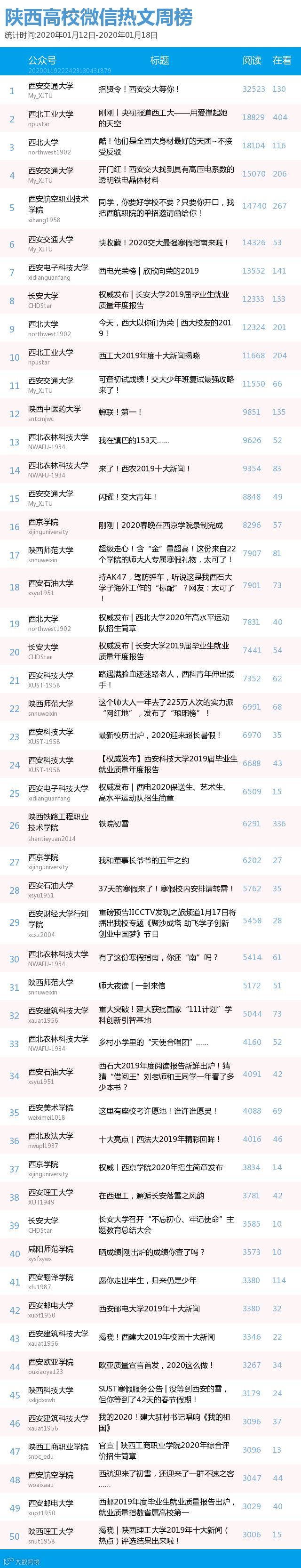 最新陕西高校微信公众号50强重磅出炉!TOP50上周共计发文200篇,贡献阅读总量56万+,在看总量6162,数据较上周有所下降,希望各大平台下期继续加油哦~(查看榜单可直接下滑)