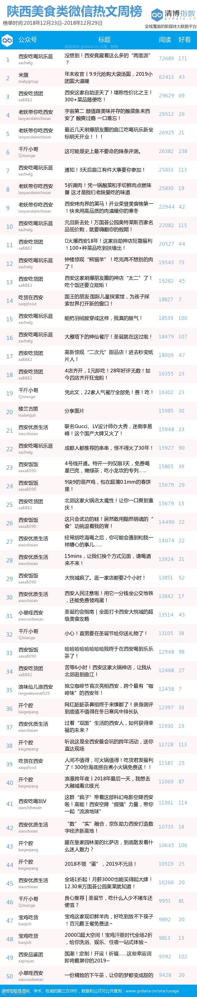 最新陕西美食类微信公众号50强重磅出炉!TOP50上周共计发文279篇,阅读总量达到122万+,好看总量达到4003。数据相比上周有所上升,期待下期各大平台继续加油哦!