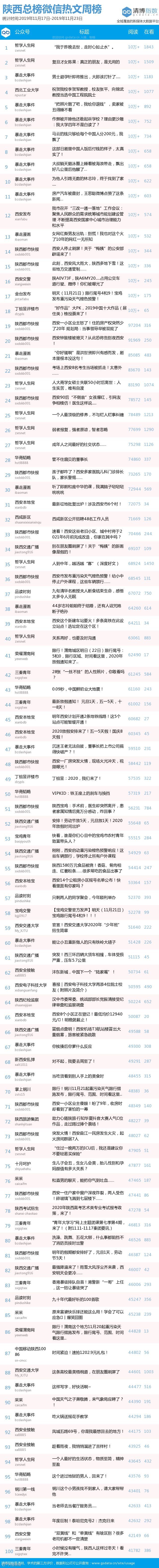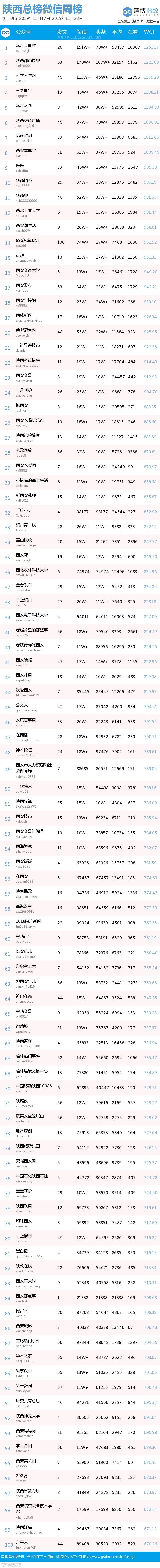 最新陕西微信公众号总榜周榜100强重磅出炉!TOP100上周共计发文2370篇,阅读总量达2044万+,在看总量10万+。各项数据相比上期基本持平,希望下期各大平台再接再厉!(查看榜单可直接下滑)