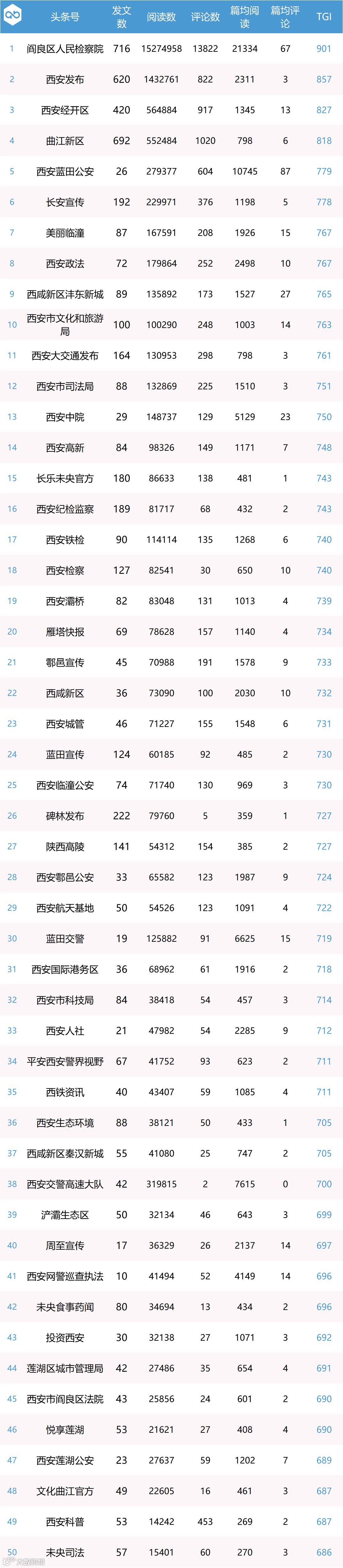 其中“阎良区人民检察院”表现优秀,发文716篇,获得1527万+阅读量和13822的评论数,以901的TGI值摘得桂冠。其次,“西安发布”发文620篇,以143万+阅读总量和857的TGI值位居榜眼之位。第3名的“西安经开区”发文420篇,以826的TGI值拿下探花之位。紧随其后的分别是“曲江新区”和“西安蓝田公安”。