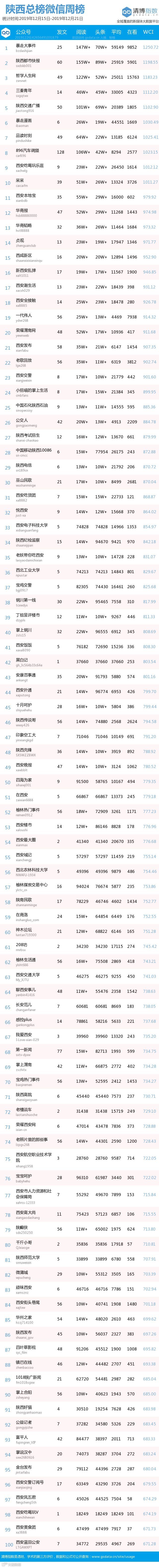 最新陕西微信公众号总榜周榜100强重磅出炉!TOP100上周共计发文2477篇,阅读总量达2017万+,在看总量11万+。各项数据相比上期均有所下降,希望下期各大平台再接再厉!(查看榜单可直接下滑)
