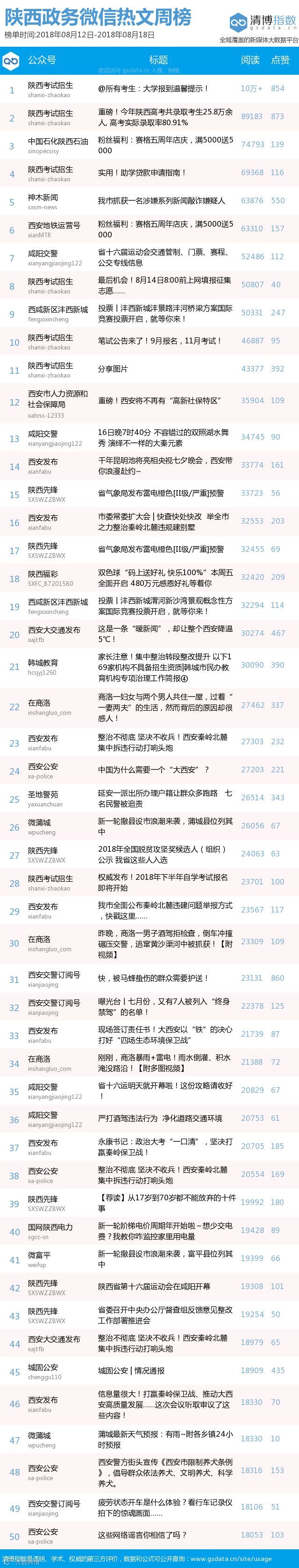 最新陕西政务微信公众号50强重磅出炉!TOP50上周共计发文944篇,阅读总量达398万+,点赞总量31090,相较上周数据有所增加,希望下期各大平台能继续加油!