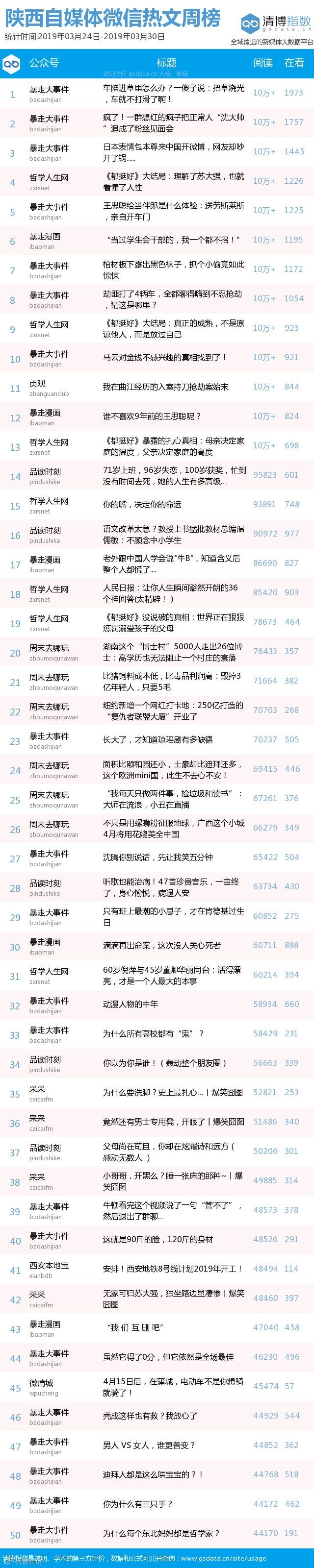 最新陕西自媒体微信公众号50强重磅出炉!TOP50上周共计发文1462篇,贡献阅读总量1218万+,在看总量6万+,发文总数较上期有所上升,贡献阅读量和在看总量指标较上期均有所。(查看榜单可直接下滑)