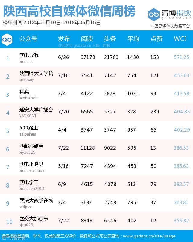 ● 本期陕西教育类新媒体周榜包含以下四个榜单:依次为陕西省教育部门官方微信周榜TOP25、陕西高校官方微信周榜TOP25、陕西高校自媒体周榜TOP10、陕西教育培训机构微信周榜TOP10。更多行业新媒体榜单可登陆清博指数官网查询:www.gsdata.cn