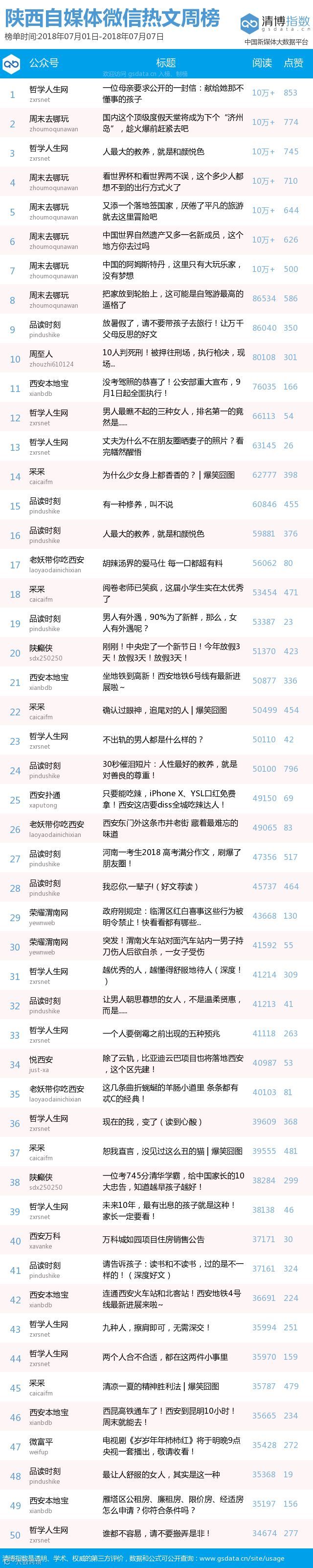 最新陕西自媒体微信公众号50强重磅出炉!TOP50上周共计发文1604篇,贡献阅读总量1236万+,点赞总量7万+,三项指标较上期均有小幅下滑(查看榜可直接下滑~)
