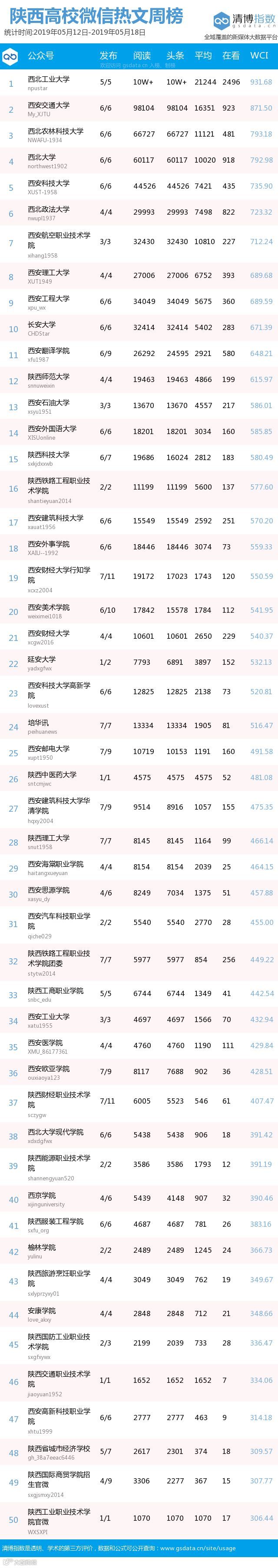 最新陕西高校微信公众号50强重磅出炉!TOP50上周共计发文269篇,数据较上周有所上升。贡献阅读总量88万+,比上期略有下降,在看总量11296,与上期数据相比有所上升。期待各大平台下期继续努力呀。(查看榜单可直接下滑)