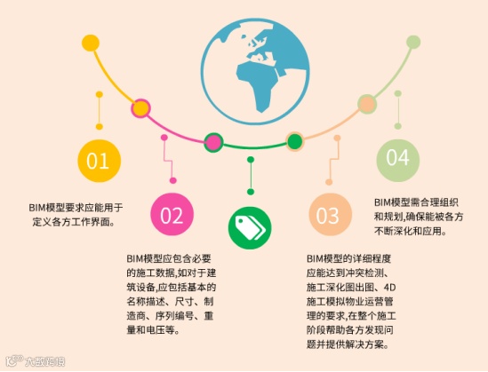 施工总承包单位在整个服务期内,应该负责协调并集成各专业BIM数据,基于BIM技术发挥施工总承包管理和组织BIM应用落地的重要作用。下面是对施工总承包单位进行BIM工作的相关基本要求: