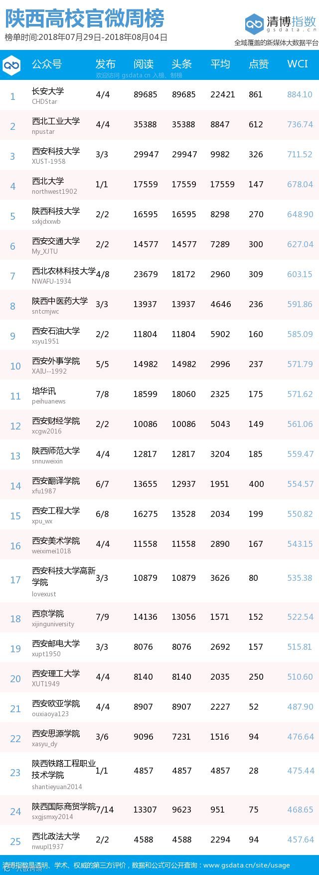 ● 本期陕西教育类新媒体周榜包含以下四个榜单:依次为陕西省教育部门官方微信周榜TOP25、陕西高校官方微信周榜TOP25、陕西高校自媒体周榜TOP10、陕西教育培训机构微信周榜TOP10。更多行业新媒体榜单可登陆清博指数官网查询:www.gsdata.cn