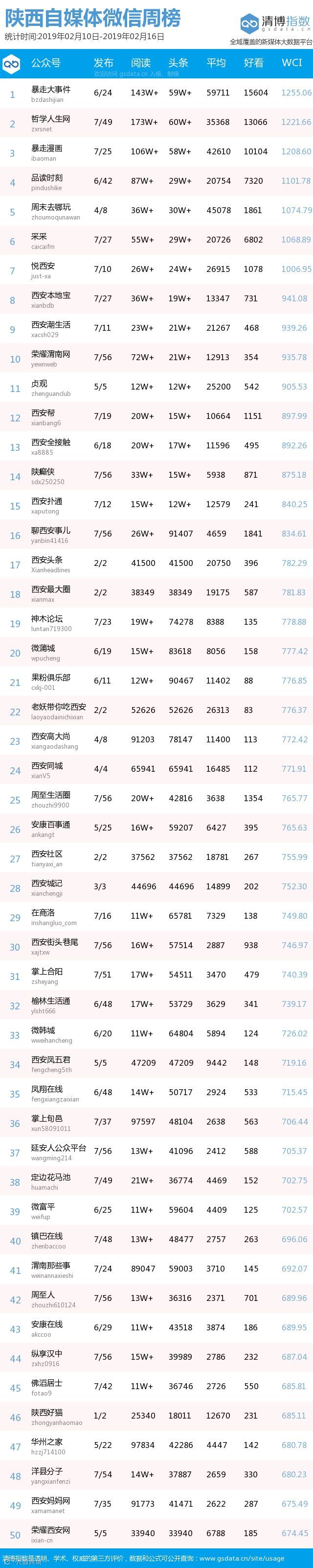 最新陕西自媒体微信公众号50强重磅出炉!TOP50上周共计发文1386篇,贡献阅读总量1258万+,好看总量7万+,三项指标较上期均有所下降。(查看榜单可直接下滑)