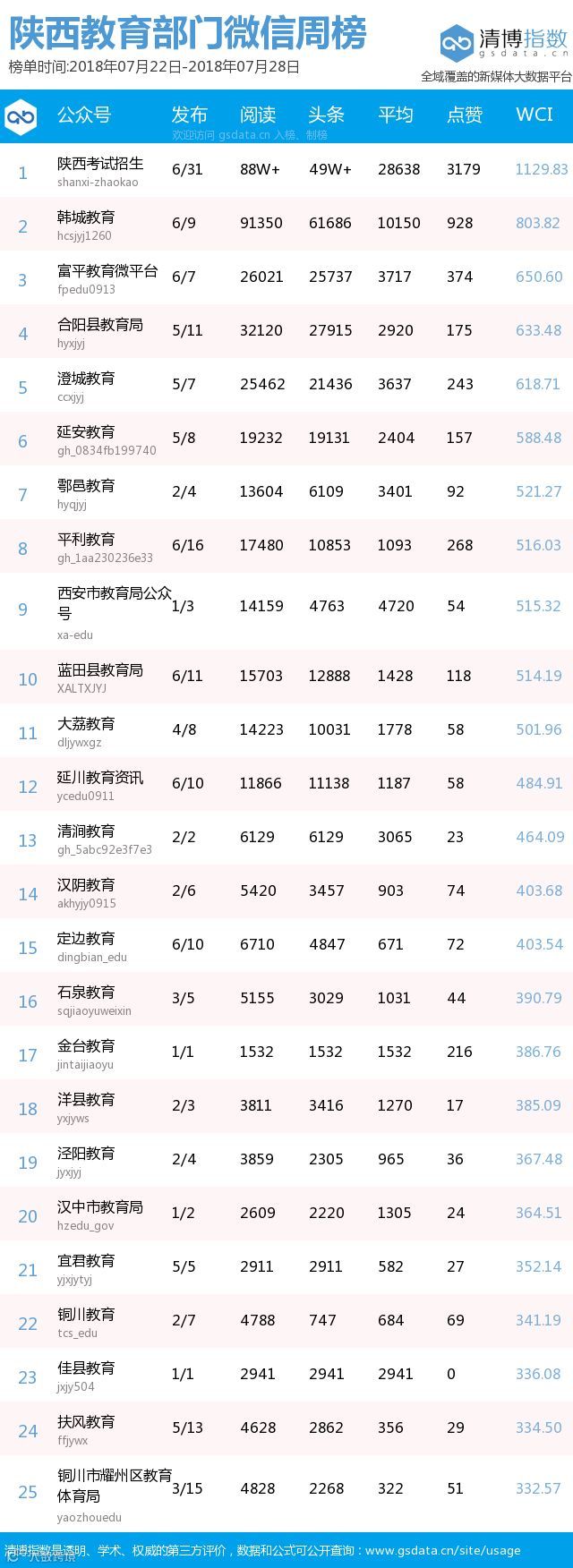 ● 本期陕西教育类新媒体周榜包含以下四个榜单:依次为陕西省教育部门官方微信周榜TOP25、陕西高校官方微信周榜TOP25、陕西高校自媒体周榜TOP10、陕西教育培训机构微信周榜TOP10。更多行业新媒体榜单可登陆清博指数官网查询:www.gsdata.cn