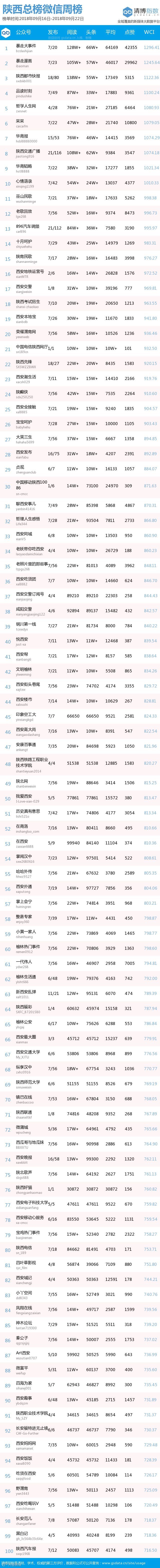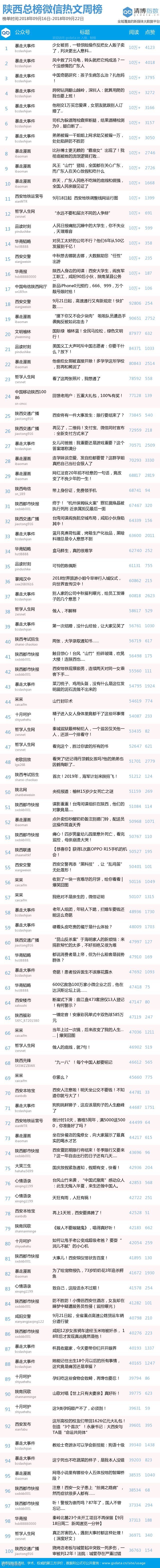 最新陕西微信公众号总榜周榜100强重磅出炉!TOP100上周共计发文2916篇,阅读总量高达2330万+,点赞总量23万+。相比上期各项数据有所下降,期待下期各大平台继续加油哦!