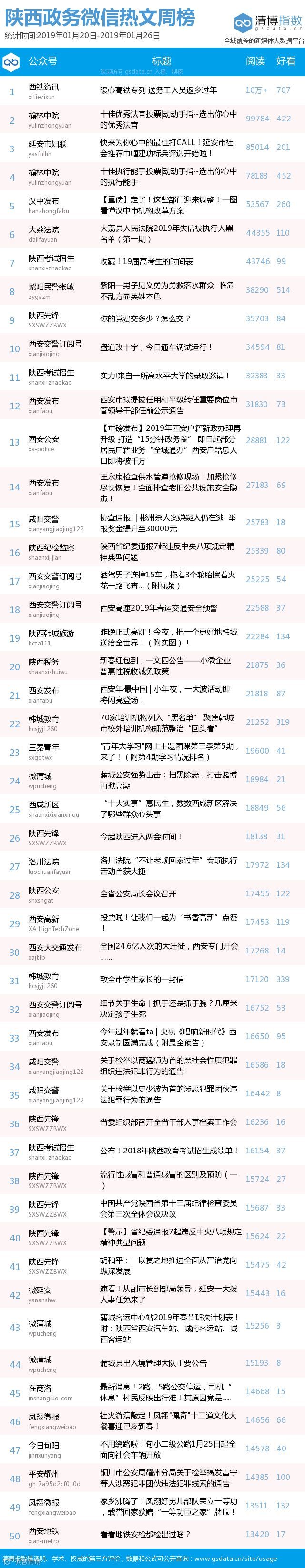 最新陕西政务微信公众号50强重磅出炉!TOP50上周共计发文933篇,阅读总量达351万+,好看总量16414,本周数据相较上周有所上升,希望下期各大平台能继续加油哦!