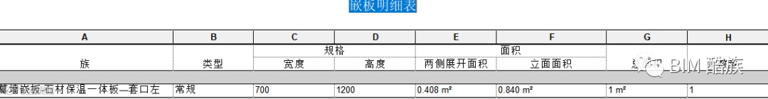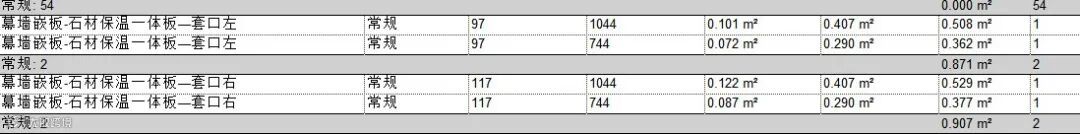 通过明细表导出该嵌板的工程量,如下图所示。该嵌板是由两个面积组成,明细表只能单独统计出来,再通过计算值将面积合并。