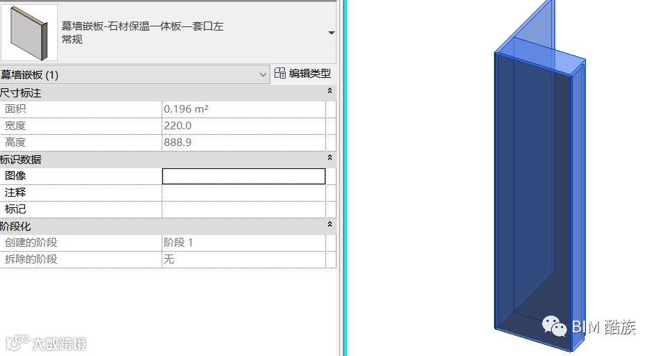 但是我们发现,Revit中该构件实例参数给出宽度和高度为网格实际尺寸,经测试如果幕墙加入内部竖挺和横挺后,嵌板宽度和高度会自动依据挺的尺寸缩尺。实例参数中的面积为该构件投影面积,即:宽度*高度=0.22*0.8889=0.196㎡。