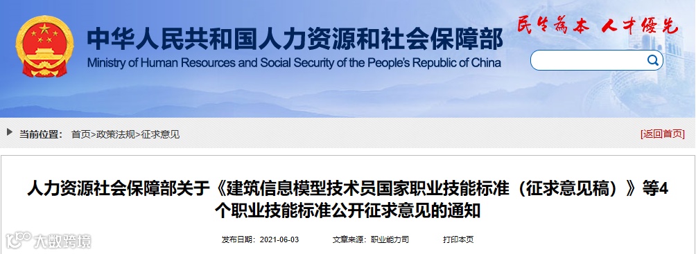 人力资源社会保障部关于《建筑信息模型技术员国家职业技能标准(征求意见稿)》等4个职业技能标准公开征求意见的通知