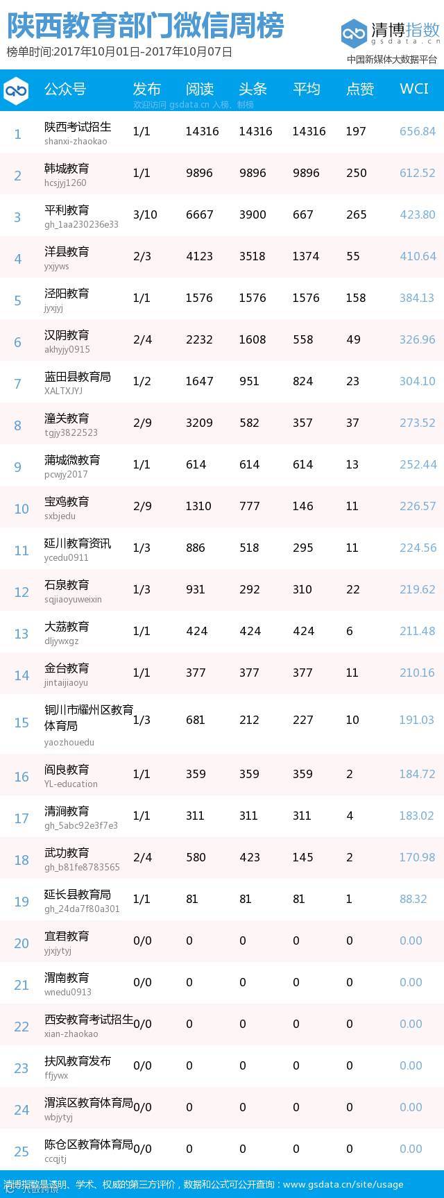● 本期陕西教育类新媒体周榜包含以下四个榜单:依次为陕西省教育部门官方微信周榜TOP25、陕西高校官方微信周榜TOP25、陕西高校自媒体周榜TOP10、陕西教育培训机构微信周榜TOP10。更多行业新媒体榜单可登陆清博指数官网查询:www.gsdata.cn