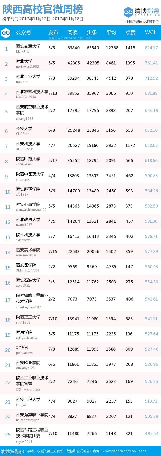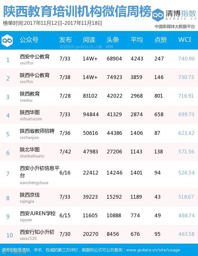 ● 本期陕西教育类新媒体周榜包含以下四个榜单:依次为陕西省教育部门官方微信周榜TOP25、陕西高校官方微信周榜TOP25、陕西高校自媒体周榜TOP10、陕西教育培训机构微信周榜TOP10。更多行业新媒体榜单可登陆清博指数官网查询:www.gsdata.cn