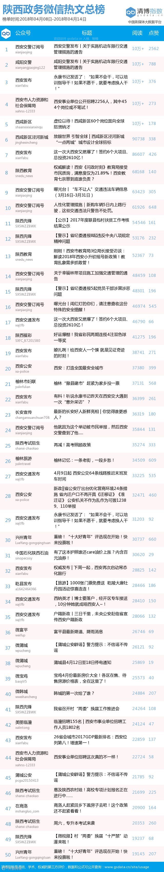 最新陕西政务微信公众号50强重磅出炉!TOP50上周共计发文1089篇,阅读总量达549万+,较上期上升166万,点赞总量39483,相较上周总体上升明显,需要继续努力加油。