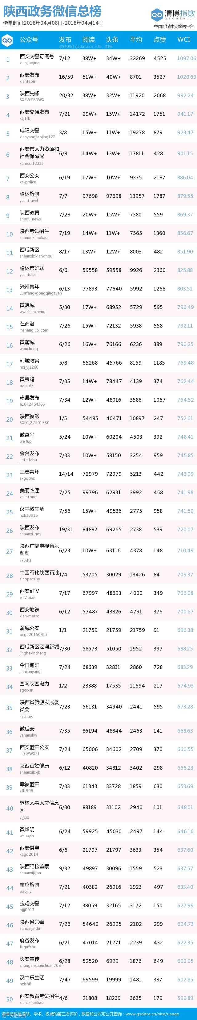 本期,“西安交警订阅号 ”表现突出,以12篇文章,38万+的阅读总量、4525的点赞及1097.06的WCI一举斩获本周榜单冠军。“西安发布” 共推送文章59篇,收获阅读量51万+,点赞总数3527,以1020.69的WCI位列榜单第二。