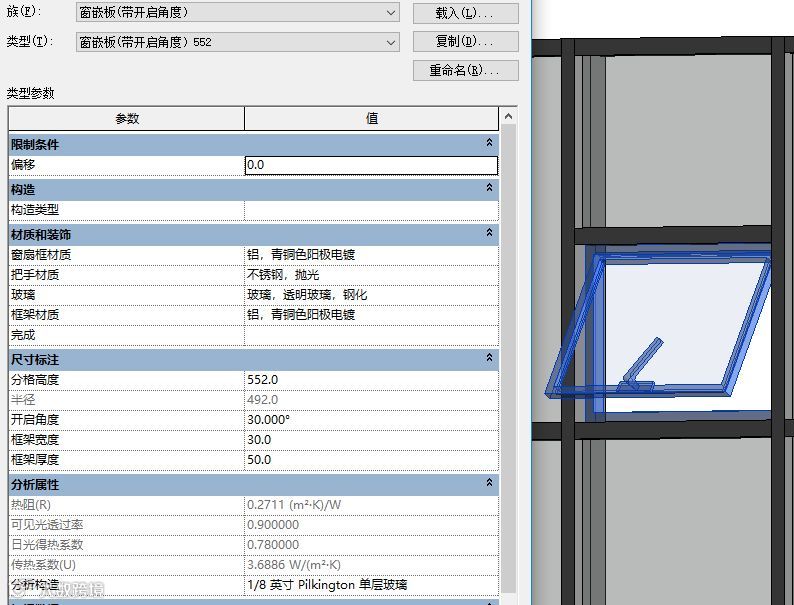 在模型创建过程中,总会碰见一些问题。问如下图所示,幕墙开启扇开启角度参数如何添加?