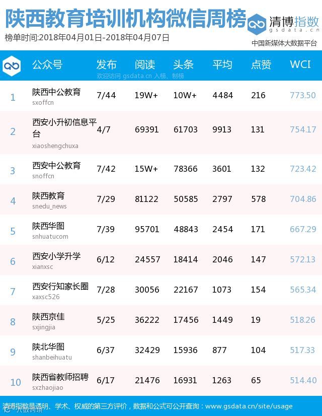 ● 本期陕西教育类新媒体周榜包含以下四个榜单:依次为陕西省教育部门官方微信周榜TOP25、陕西高校官方微信周榜TOP25、陕西高校自媒体周榜TOP10、陕西教育培训机构微信周榜TOP10。更多行业新媒体榜单可登陆清博指数官网查询:www.gsdata.cn