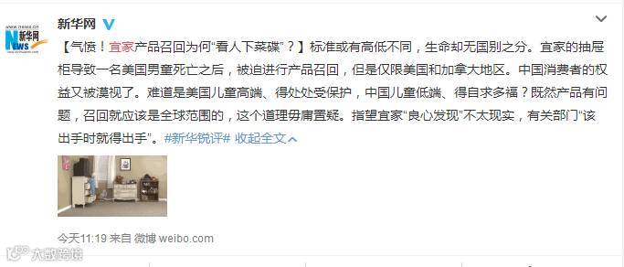 如拥有3085万粉丝的微博账号@新华网 发布博文质疑宜家产品召回是“看人下菜碟”,并表示“标准或有高低不同,生命却无国别之分。中国消费者的权益又被漠视了。难道是美国儿童高端、得处处受保护,中国儿童低端、得自求多福?既然产品有问题,召回就应该是全球范围的,这个道理毋庸置疑。指望宜家‘良心发现’不太现实,有关部门‘该出手时就得出手’。”