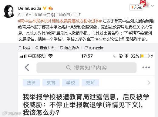 江西赣州于都实验中学高一学生刘文展在知乎发帖《我举报学校被教育局泄露信息,后反被学校威胁「不停止举报就退学」,怎么办?》,帖子称2017年3月7日,他通过国家信访实名举报于都实验中学对于初三以及高中全年级的违规补课以及收费。