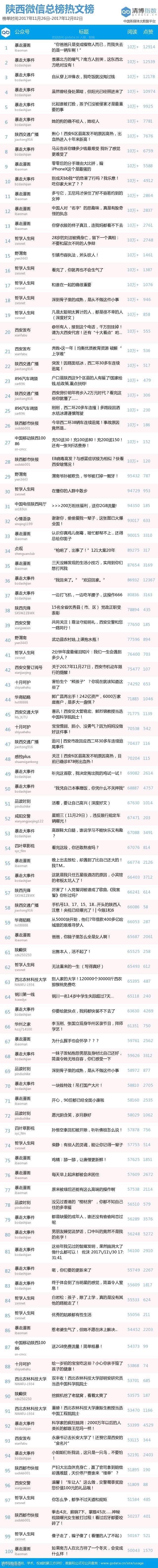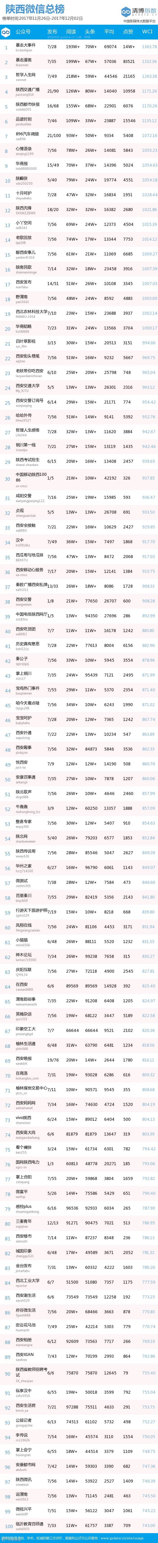 本期陕西总榜共有20个公众号WCI破千。