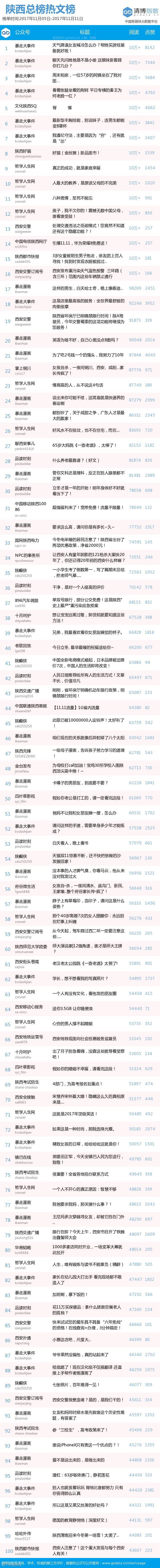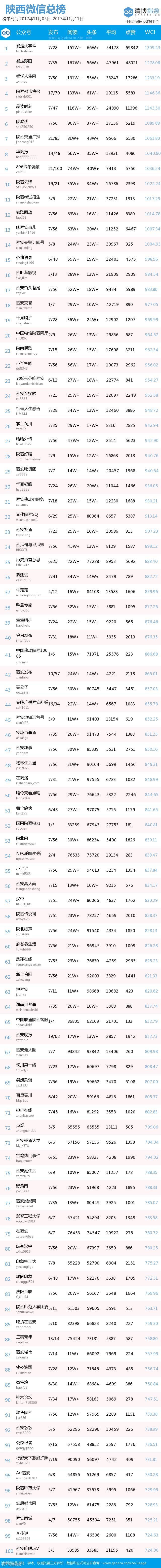 本期陕西总榜共有14个公众号WCI破千。