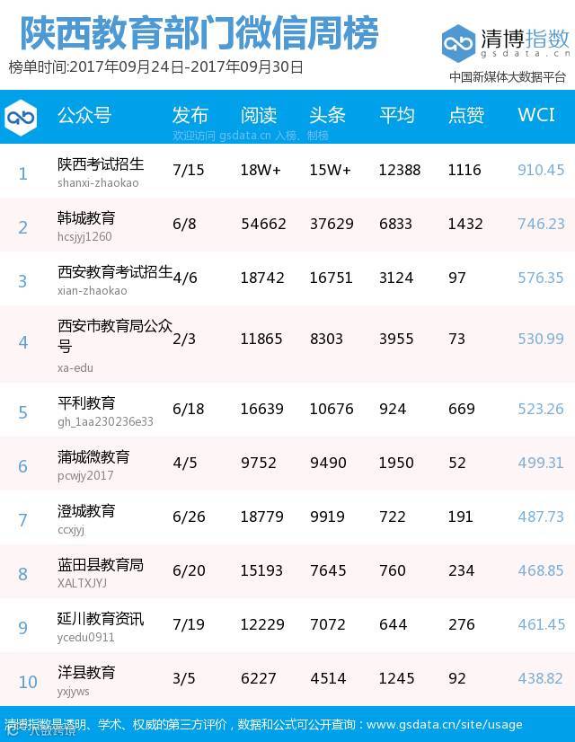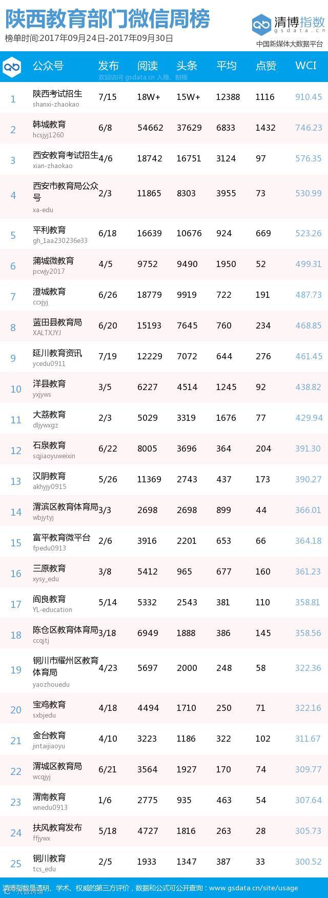● 本期陕西教育类新媒体周榜包含以下四个榜单:依次为陕西省教育部门官方微信周榜TOP25、陕西高校官方微信周榜TOP25、陕西高校自媒体周榜TOP10、陕西教育培训机构微信周榜TOP10。更多行业新媒体榜单可登陆清博指数官网查询:www.gsdata.cn