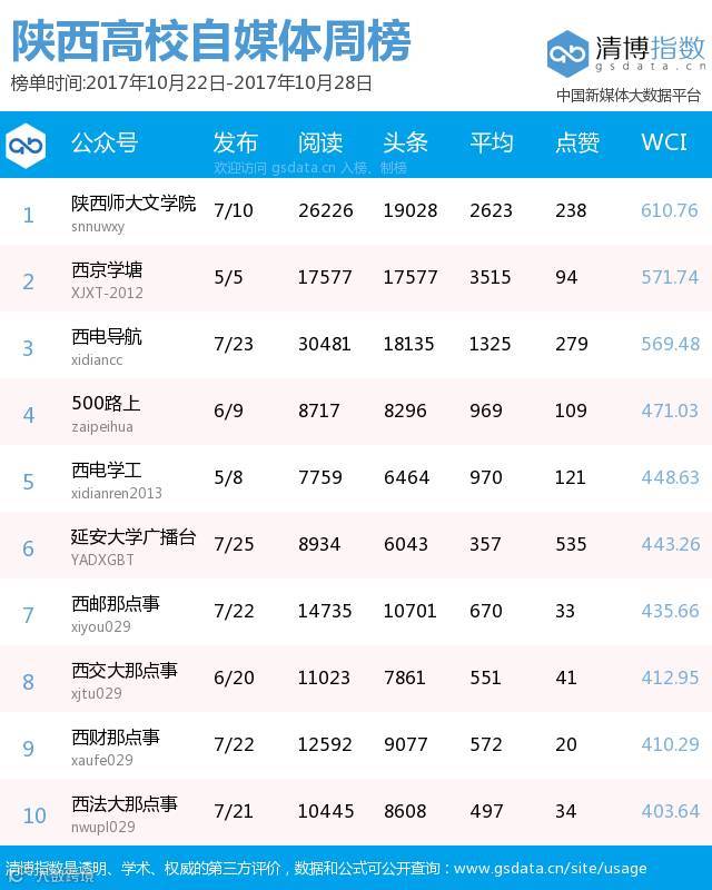 ● 本期陕西教育类新媒体周榜包含以下四个榜单:依次为陕西省教育部门官方微信周榜TOP25、陕西高校官方微信周榜TOP25、陕西高校自媒体周榜TOP10、陕西教育培训机构微信周榜TOP10。更多行业新媒体榜单可登陆清博指数官网查询:www.gsdata.cn