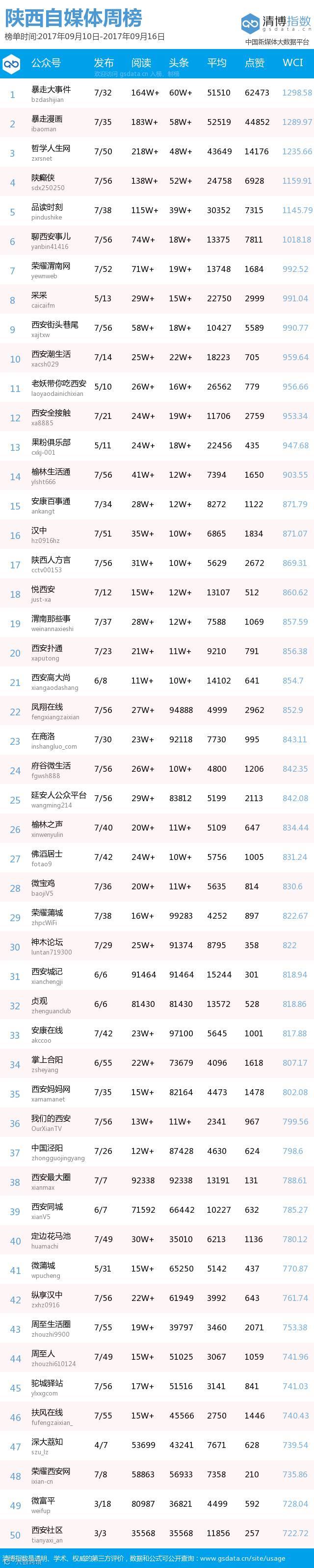 最新陕西自媒体微信公众号50强重磅出炉!TOP50上周共计发文1731篇,阅读总量高达1843万+,点赞总量19万+。相比上期阅读量增加了近47万。初秋时节,注意天气变化,及时增减衣物,预防感冒!(查看榜单可直接下滑~)