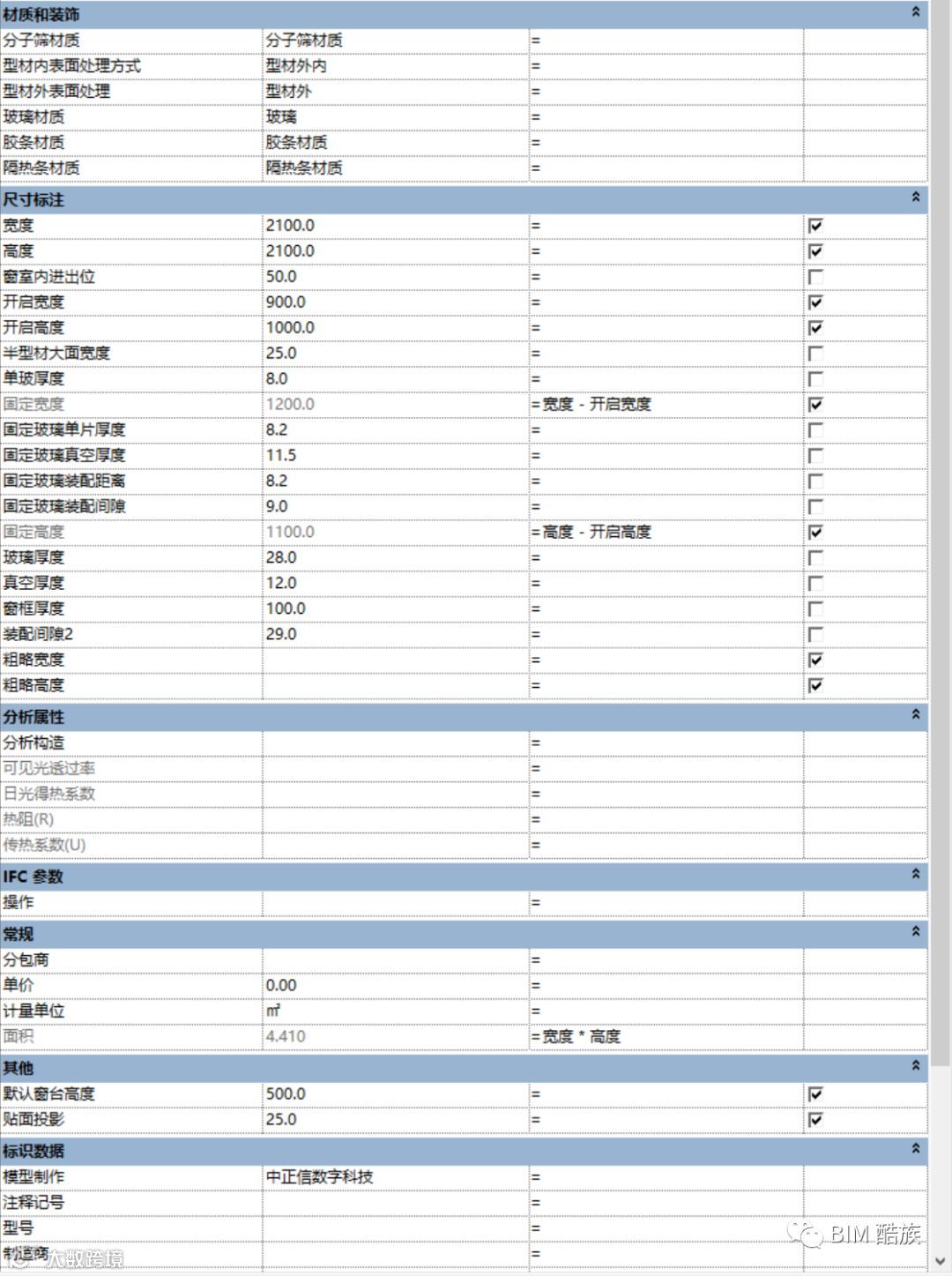本族文件采用母族嵌套各零件子族并关联参数方式创建,为方便明细表统计功能的需要,通过添加共享参数,并与部分族参数进行关联。面积统计为本整体窗面积,计入单价,即可核算出本类型单窗核价。